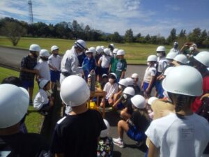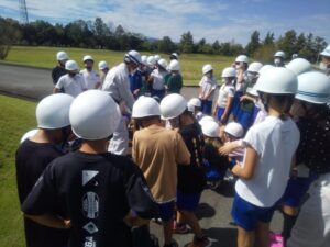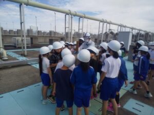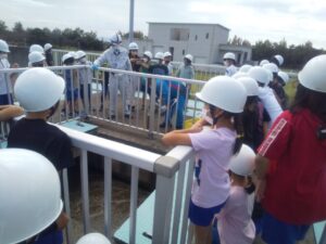 最初の見学地の松阪浄化センターの外も見学しました。ヘルメットもかぶって、安全に気を付けて見学しました。汚水・下水の処理がどのようにされているか分かったでしょうか?