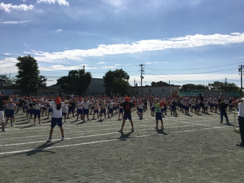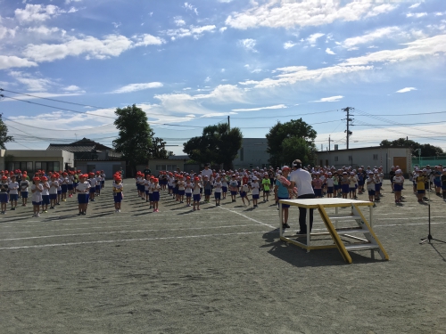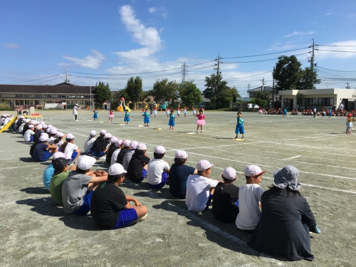 運動会が近づいてきました。明日は前日準備です。今日は、開会式から閉会式までの練習の後、5・6年生が幼稚園の演技を見せてもらいました。併設園だからこそできるよい光景でした。