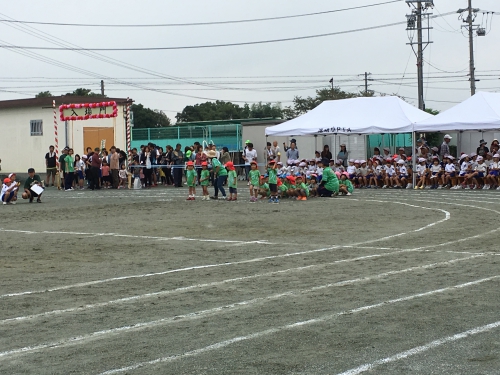 本日1時間遅れで運動会を開催しております。現在プログラム15 幼稚園による大玉ころがしです。12:15までプログラム順に進め昼休憩とします。5・6年生の表現種目は最終種目とさせていただきます。なお、新入児の「旗取り」は現在の所、13:00開始予定です。黄色い帽子の採寸もしております。
