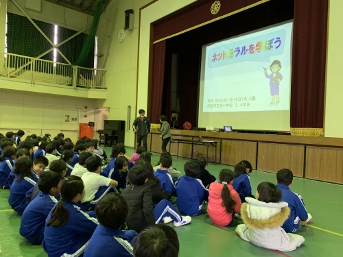 1月15日(水)3年生から6年生を対象にネットモラルについての学習を行いました。講師の先生が事前にとったアンケートをもとに何が危険かをわかりやすく話してくださいました。多くの子どもたちが、これまでスマホやゲームで長時間遊んでいたけど気をつけたいと感想を書いていました。