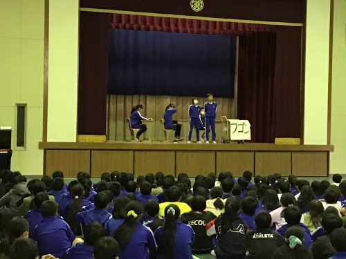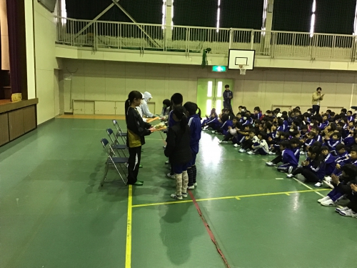 日頃お世話になっている、調理員さん、校務員さんの仕事をクイズや劇で伝えてくれたり、片づけの上手なクラスや残食の少ないクラスの表彰をしたりしてくれました。最後は、クラスの代表が、感謝の気持ちを込めてメッセージと花束を渡しました。