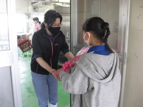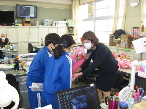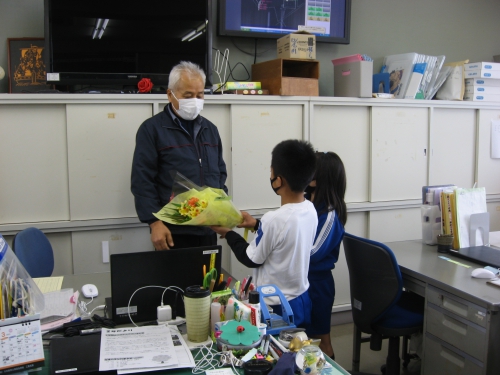 その後の離任式では、離任される先生方から、ひと言ずつ挨拶をいただきました。心のこもった言葉に、ジーンと響くものがありました。そのあと、感謝の気持ちを込めて、児童会から感謝の花束を贈りました。