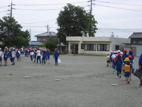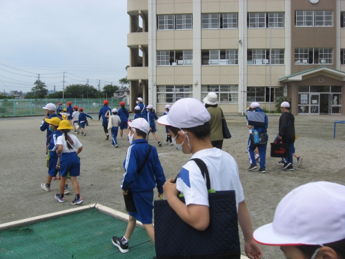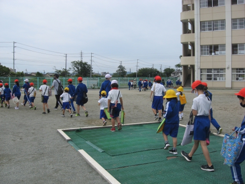 9時に全員運動場に出て、班と班との間を空けながら、出発前のお話を聞きました。